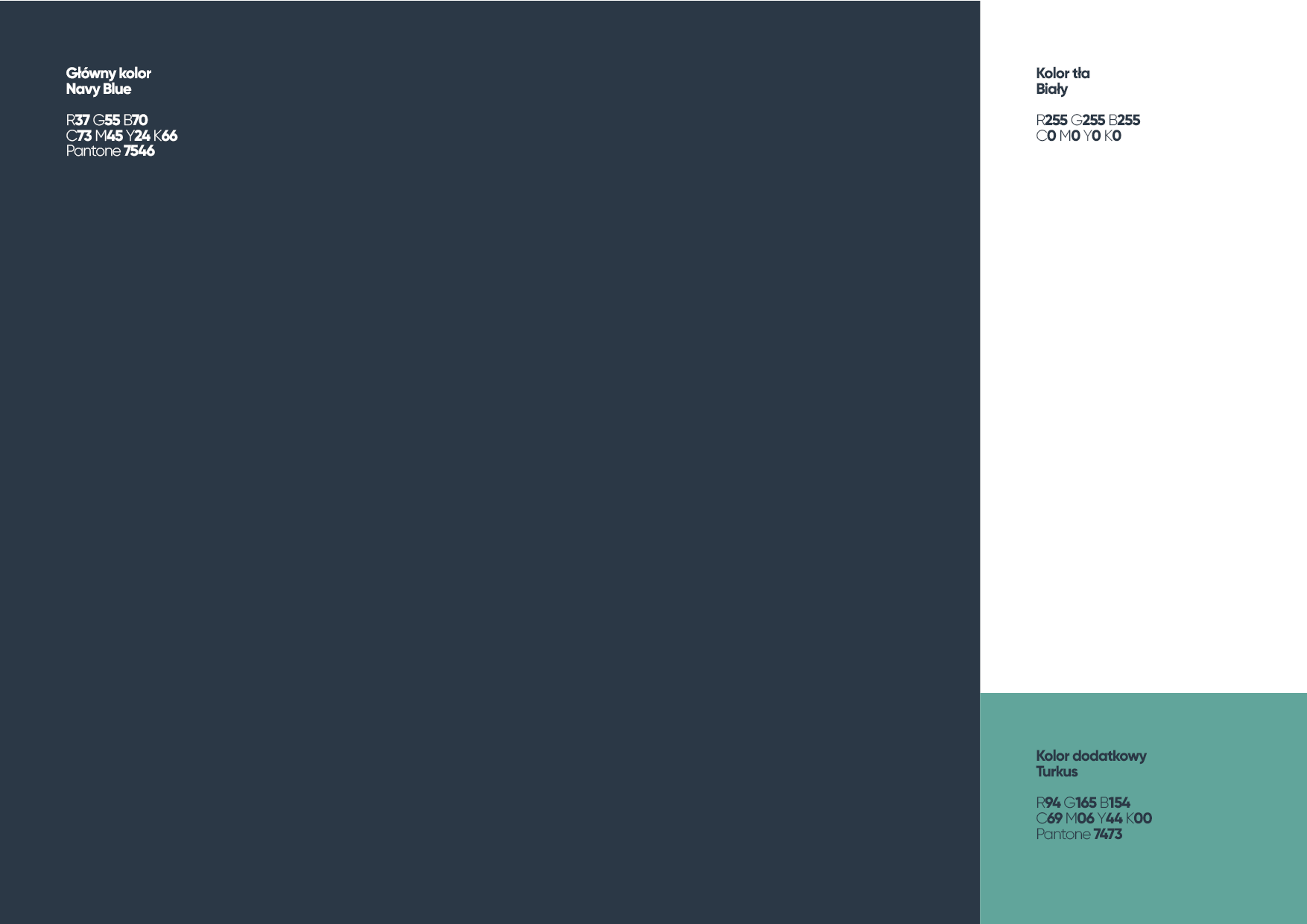 Kolorystyka identyfikacji wpływa na odbiór marki jako godnej zaufania, silnej i stabilnej. Statyka granatu i bieli przełamana zostaje turkusem pomagając wprowadzać elementy wymagające uwagi.