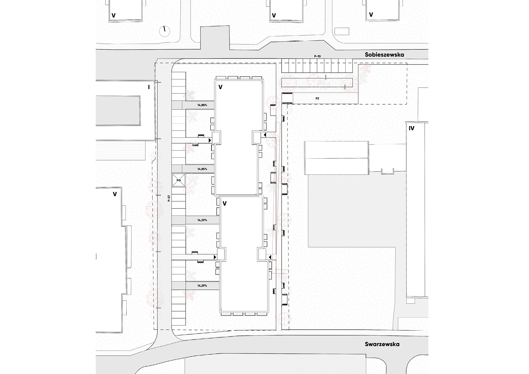 Działka, na której zlokalizowana jest zabudowa znajduje się w Bydgoszczy, przy ul. Swarzewskiej. W sąsiedztwie znajduje się zespół zabudowy mieszkaniowej o zróżnicowanej strukturze. Długie pasy bloków mieszkalnych od północy oraz punktowa zabudowa od południa wyznaczyły kierunek w kształtowaniu zabudowy mieszkaniowej.