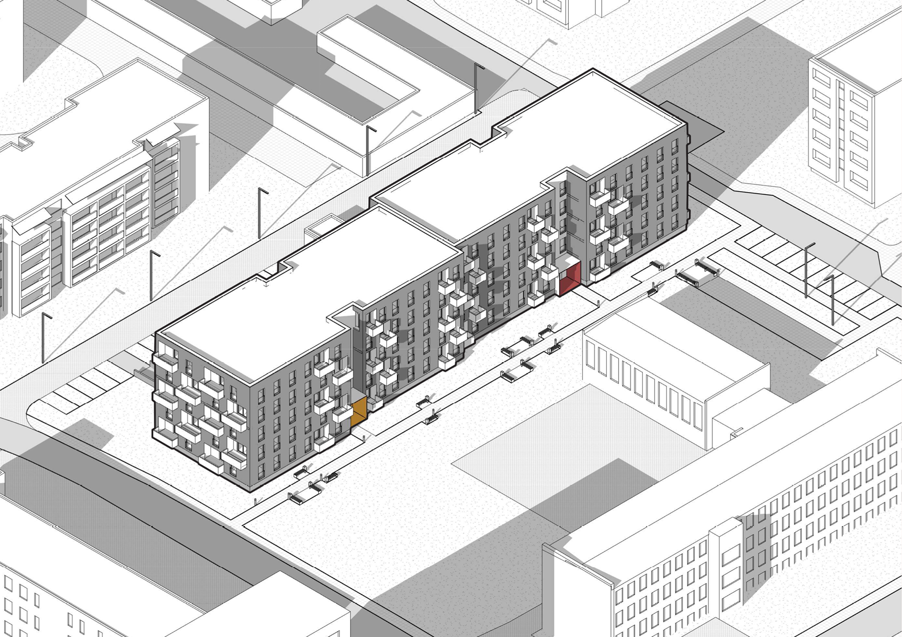 Poszanowanie kontekstu urbanistycznego odbywa się przez zaprojektowanie podłużnej bryły z jednoczesnym podziałem jej na cztery segmenty. Charakterystycznym detalem zaprojektowanym dla zespołu są ramowe strefy wejściowe w kontrastowych kolorach. Proste i rytmiczne podziały okienne zostały przełamane mijankową zasadą kształtowania loggii.