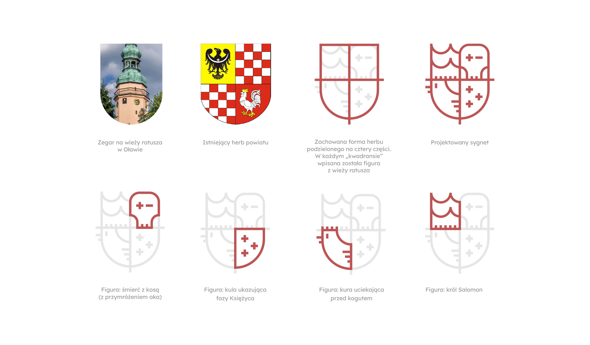Inspiracją do projektu konkursowego na logo Powiatu Oławskiego był zegar figuralno-astronomiczny, z początku XVIII wieku, znajdujący się na ośmiobocznej części wieży ratusza.